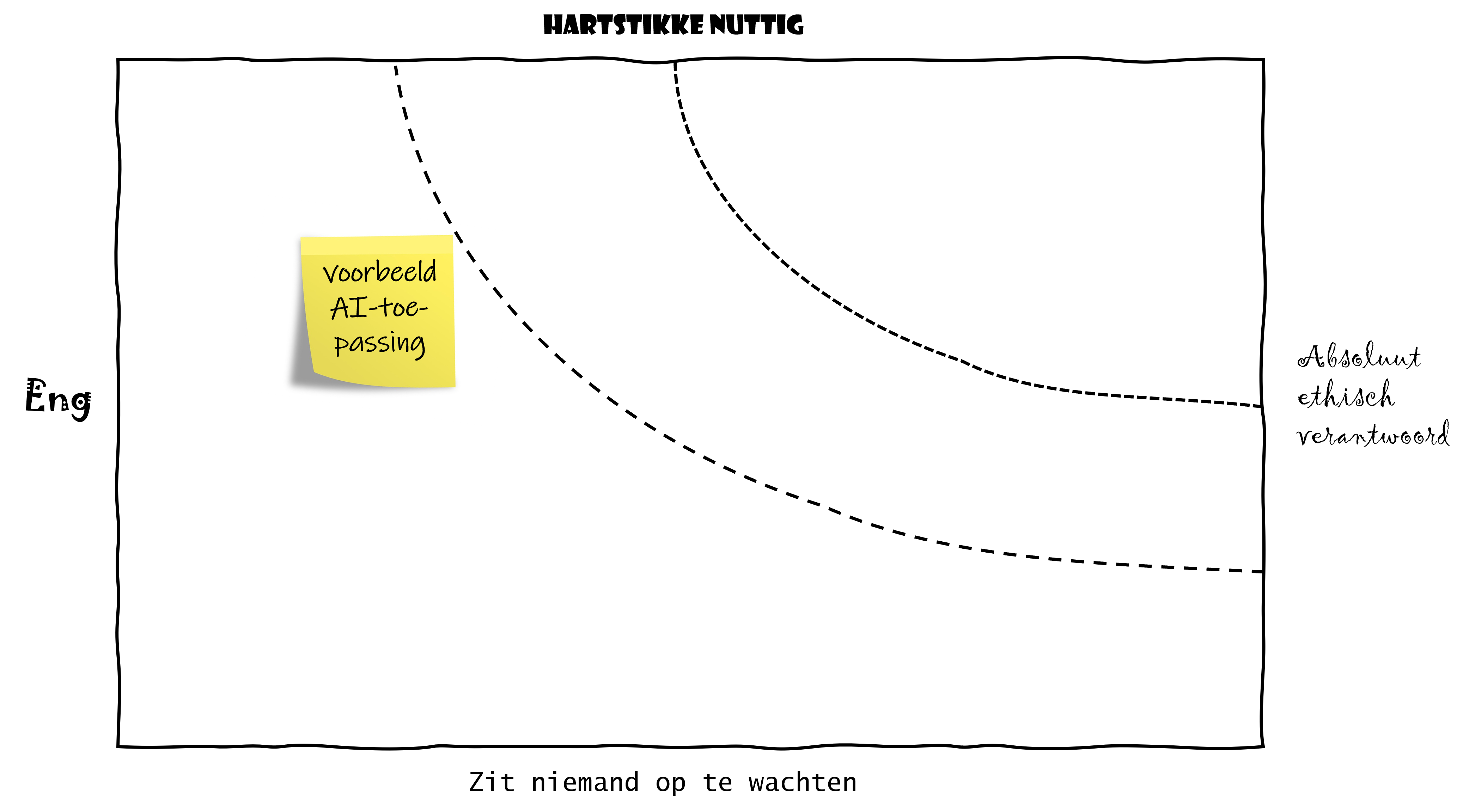 Op de verticale as plaatsen we het nut van de AI toepassing. Deze schaal loopt van ‘Zit niemand op te wachten’ tot ‘Hartstikke nuttig’. Net als bij de horizontale as maak je een checklist waarmee je een AI-toepassing zo objectief mogelijk kunt beoordelen.