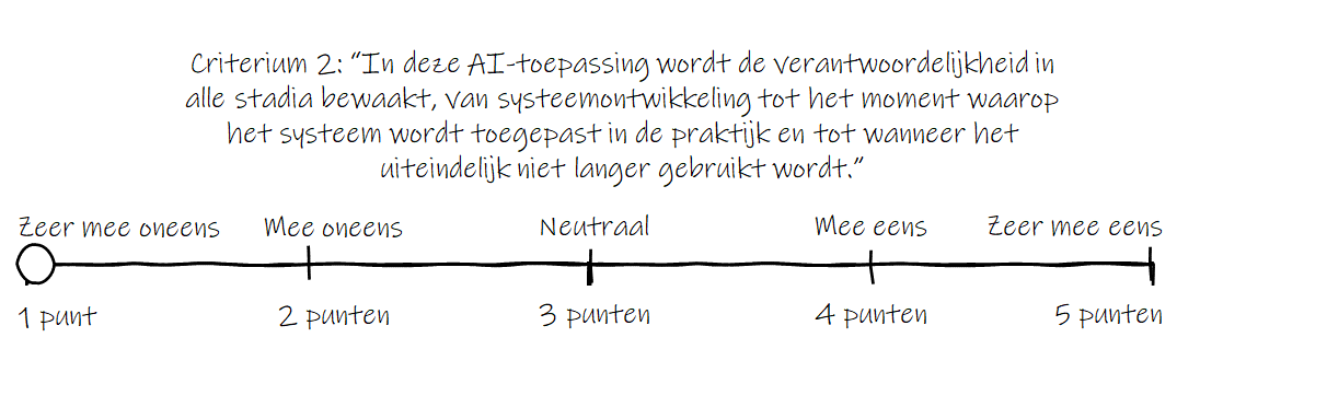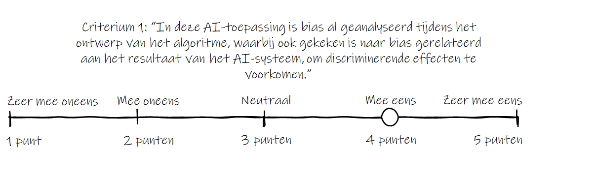 Kies vooral je eigen manier om de manier van beoordelen uit te werken. Een voorbeeld hoe je dit kunt doen: maak gebruik van een zogenoemde 5-punts Likert-schaal om criteria in de vorm van stellingen met betrekking tot de FAST-principes aan de AI-toepassing te toetsen. Likert-schalen worden veel gebruikt om houdingen en meningen genuanceerder in kaart te brengen dan mogelijk is met eenvoudige ja/nee-vragen. Aan de hand van een aantal criteria kun je dan op een onderbouwde manier in kaart brengen hoe ethisch verantwoord een specifieke AI-toepassing is. Een voorbeeld van zo’n criterium en van de wijze waarop je een 5-punts schaal kunt maken om een AI-toepassing te scoren: