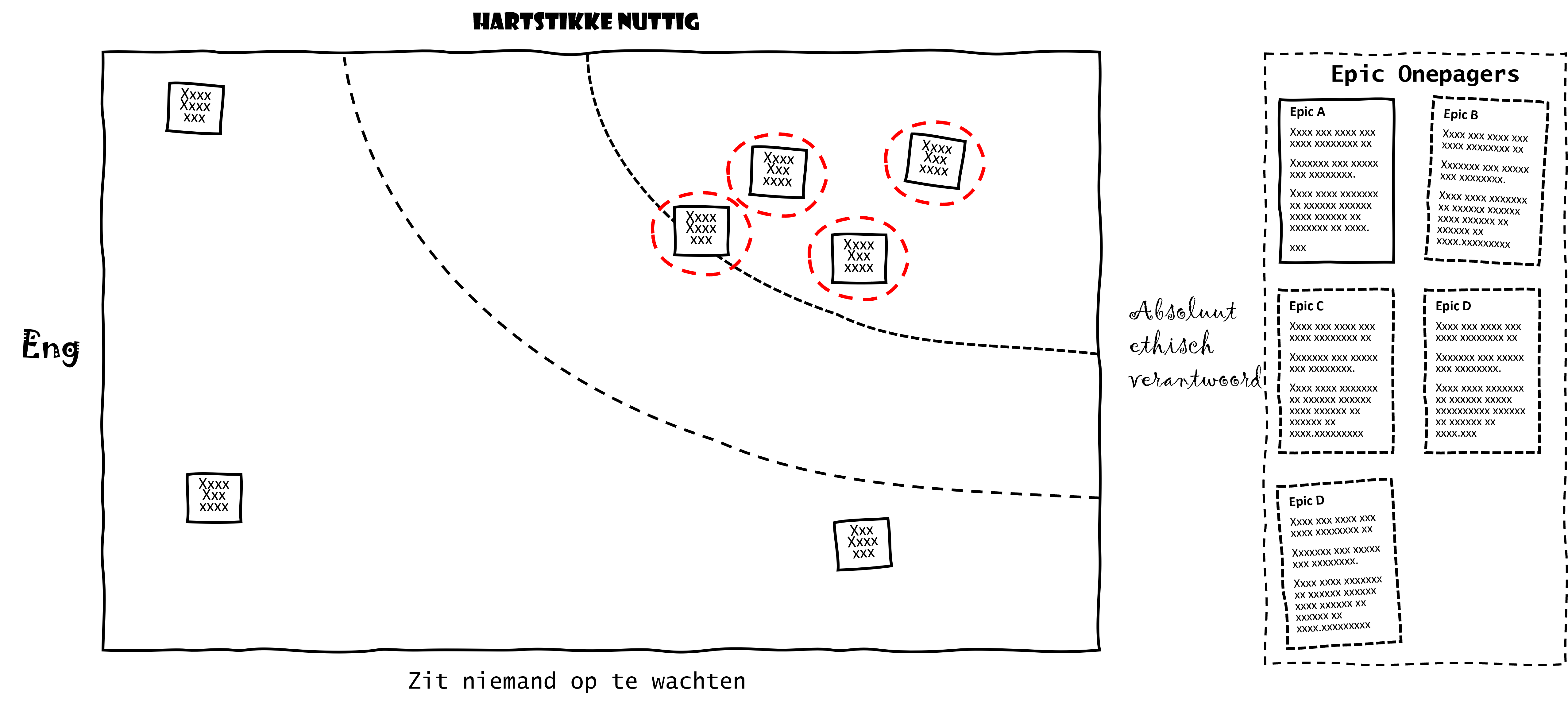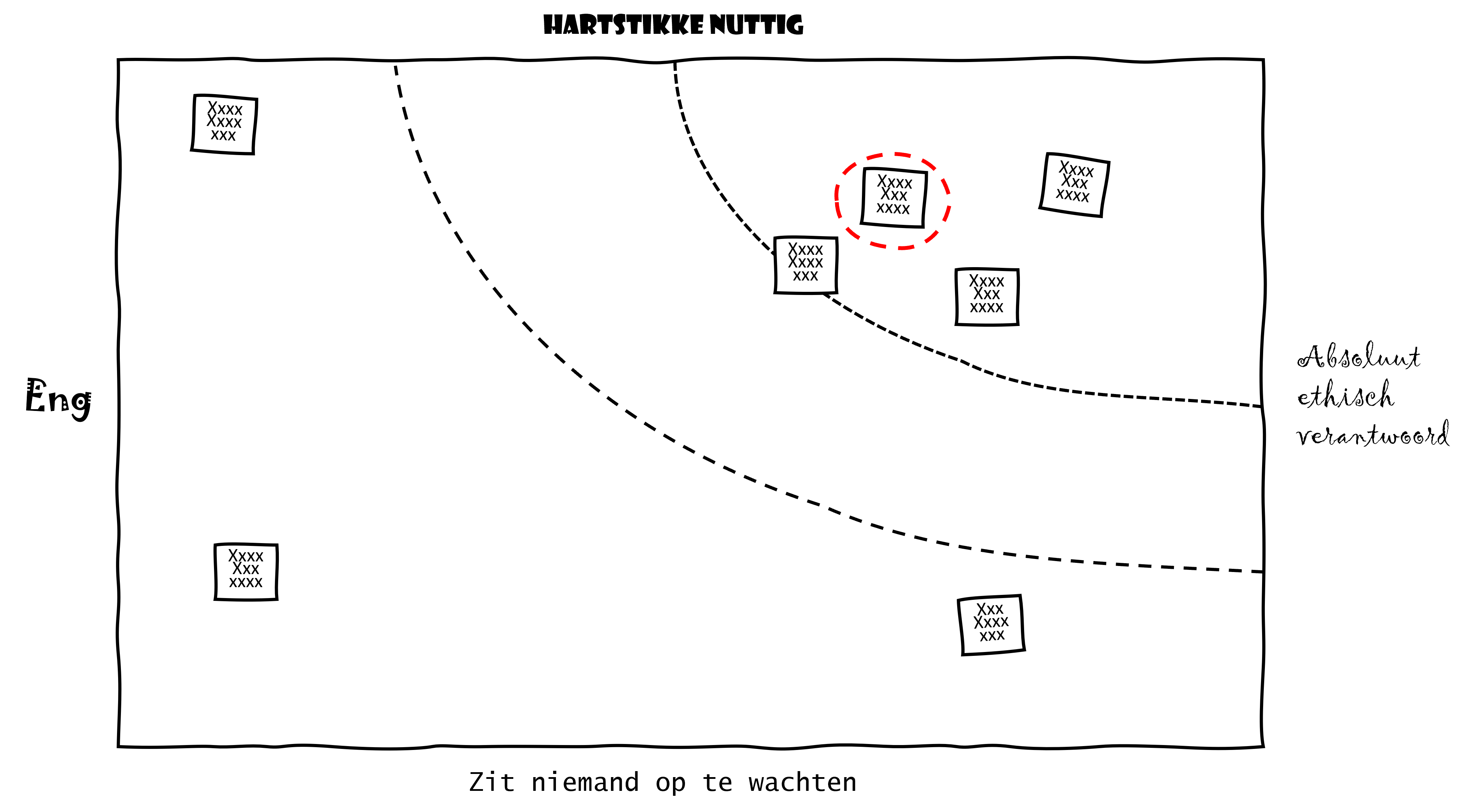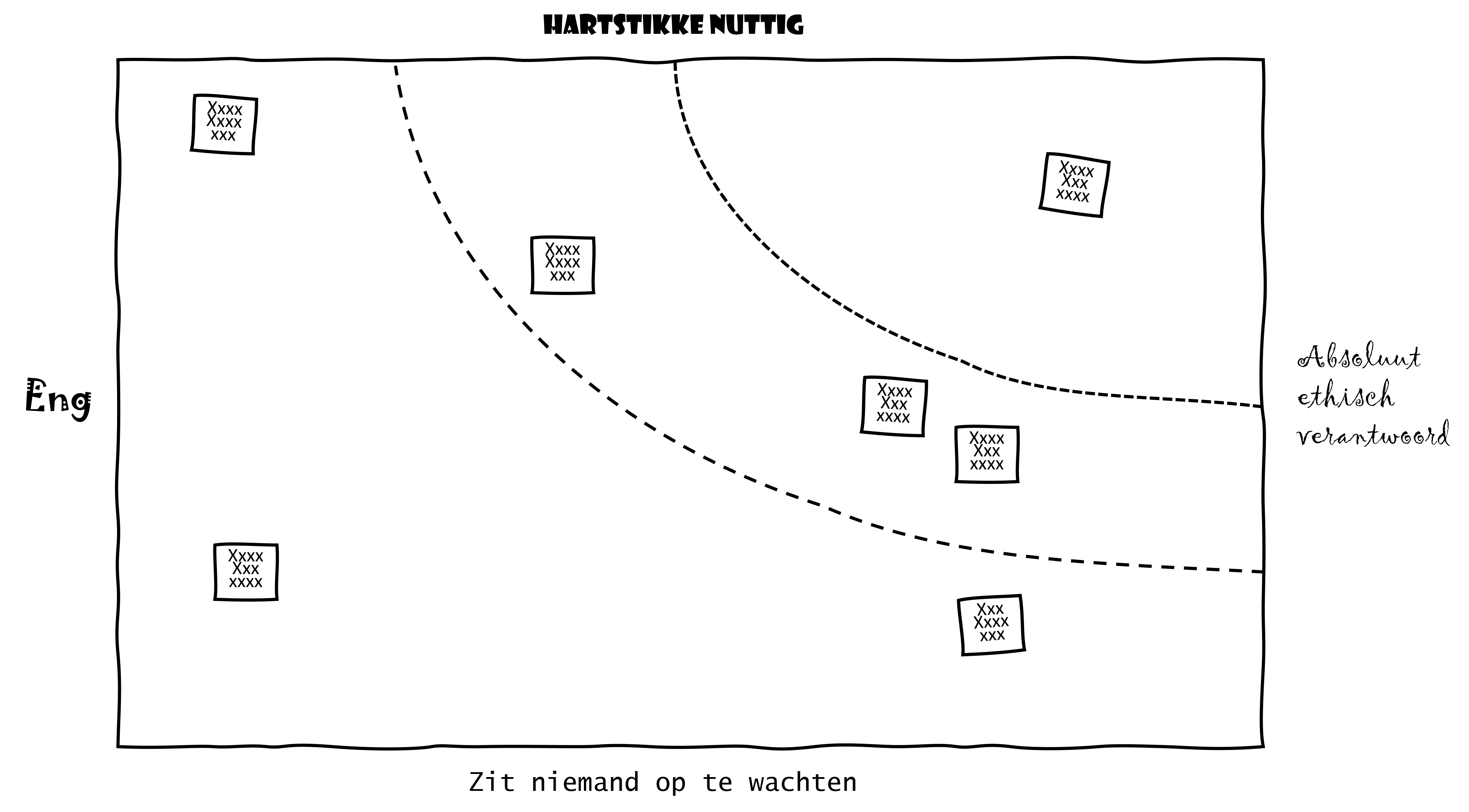 Voordat jullie aan de slag gaan printen jullie eerst voorbeeldcases, zorgen jullie voor stiften en post-it notes en tekenen jullie een “engheidsmatrix” op grote vellen papier op de muur van het lokaal: